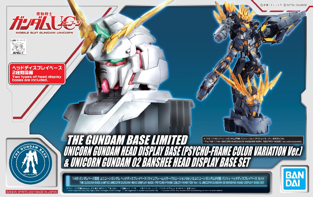 La Gundam Base Tokyo and Fukuoka ajoute le 1/48 UNICORN GUNDAM HEAD DISPLAY BASE (PSYCHO-FRAME COLOR VARIATION VER.) & UNICORN GUNDAM 02 BANSHEE HEAD DISPLAY SET dans leur ligne de kits à tirage limité.