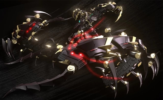 L’ensemble comprend diverses armes et accessoires mais également équipée d’armements en forme de mille-pattes qui peuvent être attachés à son dos.