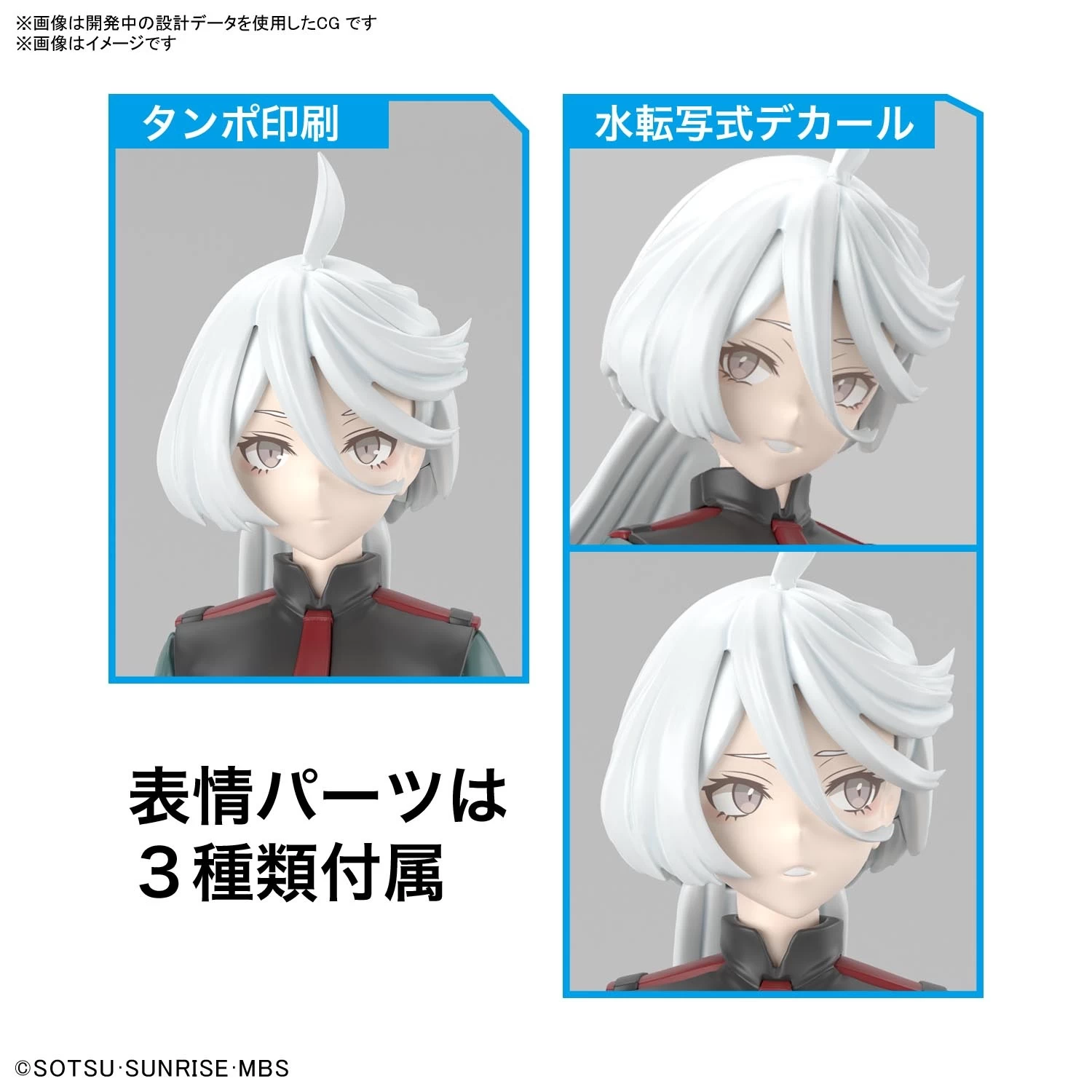 Les abondantes expressions faciales sont reproduites avec une partie tampographiée et deux parties pour les décalcomanies à transfert d’eau. Chaque détail a été minutieusement étudié pour produire l’expression de fraîcheur de Miorine.